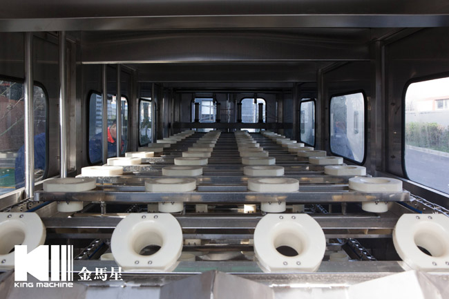 本設備集合了消毒、沖洗、灌裝和壓蓋,合四為一,能夠實現全自動桶裝水旋蓋。沖瓶機使用多種沖品液和消毒液,以保證獲得沖瓶和殺菌效果。消毒液可以循環使用,節省消耗。