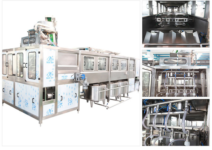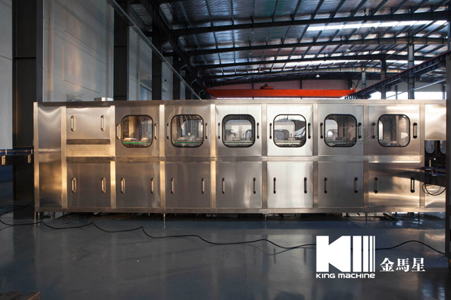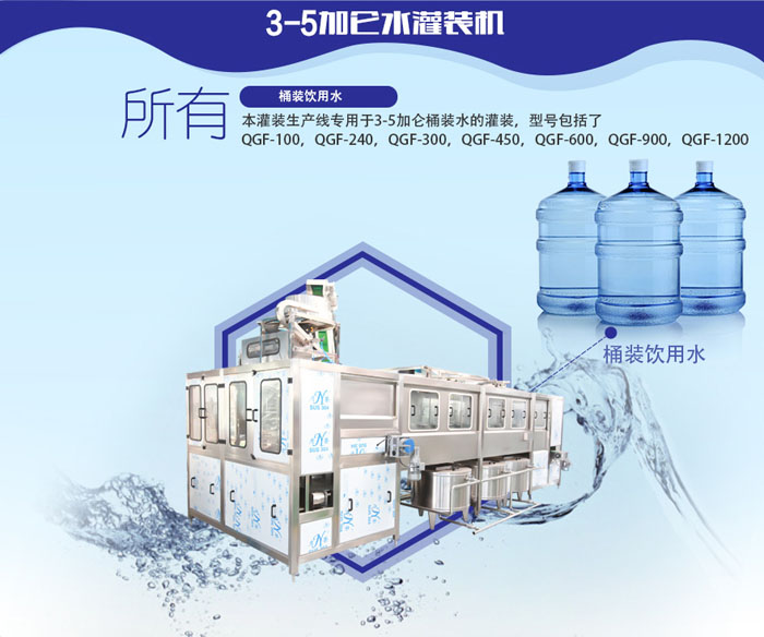 本灌裝生產(chǎn)線專用于3-5加侖桶裝水的灌裝,型號包括了QGF-100,QGF-240,QGF-300,QGF-450,QGF-600,QGF-900,QGF-1200。合沖洗、灌裝、旋蓋三為一體。沖洗機(jī)采用了多種洗液以及消毒液對瓶子進(jìn)行清洗以及消毒,消毒液能夠循環(huán)使用。瓶蓋會在清洗和消毒后運至旋蓋機(jī)自動進(jìn)行旋蓋。本產(chǎn)品功能齊全,涵蓋了清洗、消毒、灌裝、旋蓋、計數(shù)等功能,高度自動化,實為飲料生產(chǎn)廠家理想的優(yōu)先設(shè)備。