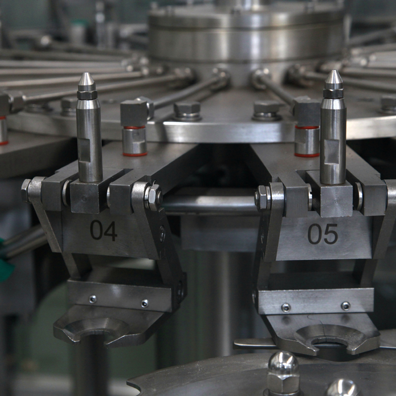 本機主要用于飲料的灌裝作業。本機將洗瓶、灌裝、封口三功能合在一個機體上,全過程實現自動化、適用于聚酯瓶、塑料瓶灌裝礦泉水、純凈水,加上溫控裝置還可以進行熱灌裝。各部分的適用瓶型調整采用手柄轉動實現,輕松自如,簡便快捷。灌裝方式采用了新型的微壓灌裝,使灌裝速度更快更穩定,所以同規格的機器相比本機的產量更高,效益更大。本機采用了優良的OMRON可編程控制器(PLC)控制機器的自動運行,進瓶鏈道采用變頻器調速,與主機變頻器的調速相互配合使進瓶運行更穩定可靠。光電檢測各部件的運行狀況,所以自動化程度高,操作簡便。在此基礎上,本機變更灌裝部分;可以形成低真空灌裝方式和等壓灌裝方式。低真空灌壓方式(Z型機),適用于玻璃瓶,灌裝酒類、醬油等物料,其封口方式可以選配鋁金屬防盜蓋和塑料蓋。等壓灌裝方式(Y型機)適用于聚酯瓶,塑料瓶灌裝含汽飲料,是飲料生產廠家理想的優選設備。
