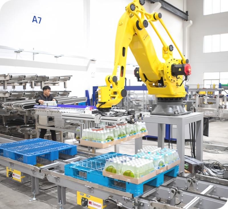 本機(jī)器人碼垛系統(tǒng)僅適用于20-25包/分鐘的液體灌裝包裝線碼垛。